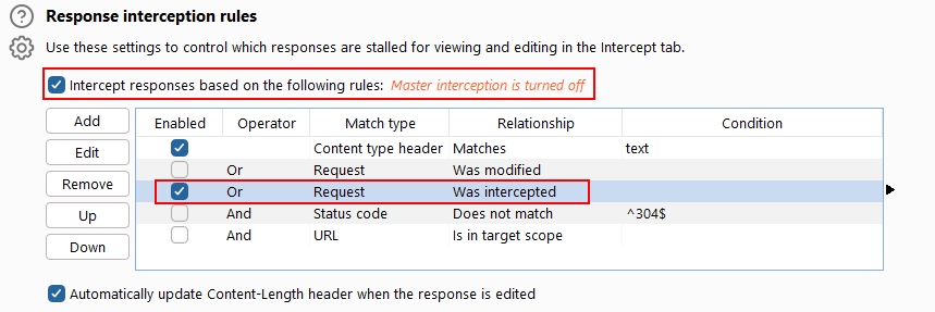 - Response Interception: By default, the proxy does not intercept server responses unless explicitly requested on a per-request basis. The "Intercept responses based on the following rules" checkbox, along with the defined rules, allows for a more flexible response interception.