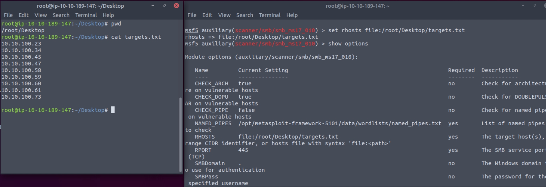 - RHOSTS: “Remote host”, the IP address of the target system. A single IP address or a network range can be set. This will support the CIDR (Classless Inter-Domain Routing) notation (/24, /16, etc.) or a network range (10.10.10.x – 10.10.10.y). You can also use a file where targets are listed, one target per line using file:/path/of/the/target_file.txt, as you can see below.