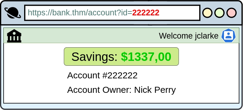 For example, let's say we're logging into our bank account, and after correctly authenticating ourselves, we get taken to a URL like this https://bank.thm/account?id=111111. On that page, we can see all our important bank details, and a user would do whatever they need to do and move along their way, thinking nothing is wrong.