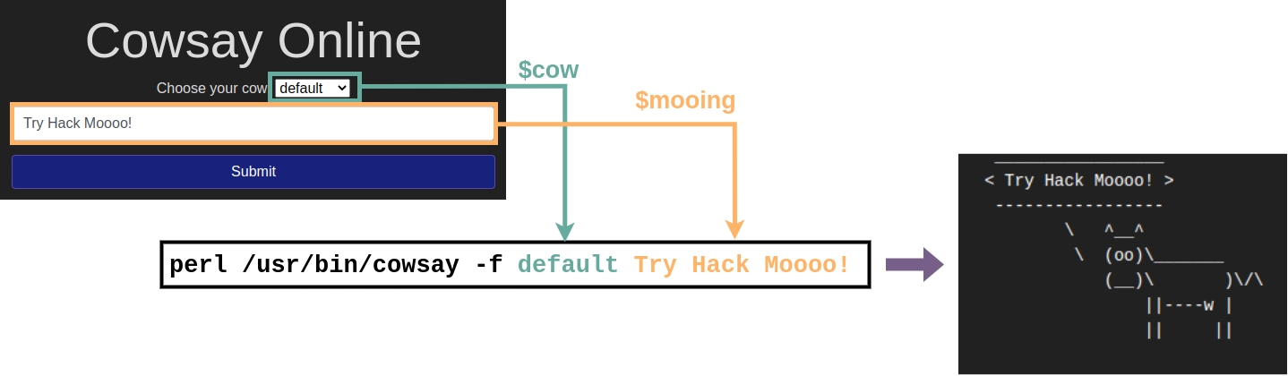 passthru("perl /usr/bin/cowsay -f $cow $mooing");. The passthru function simply executes a command in the operating system's console and sends the output back to the user's browser. You can see that our command is formed by concatenating the $cow and $mooing variables at the end of it. Since we can manipulate those variables, we can try injecting additional commands by using simple tricks. If you want to, you can read the docs onpassthru()on PHP's website for more information on the function itself.