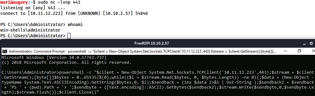 In order to use this, we need to replace "<IP>" and "<port>" with an appropriate IP and choice of port. It can then be copied into a cmd.exe shell (or another method of executing commands on a Windows server, such as a webshell) and executed, resulting in a reverse shell: