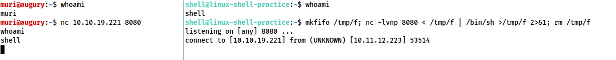 . It then starts a netcat listener, and connects the input of the listener to the output of the named pipe. The output of the netcat listener (i.e. the commands we send) then gets piped directly intosh