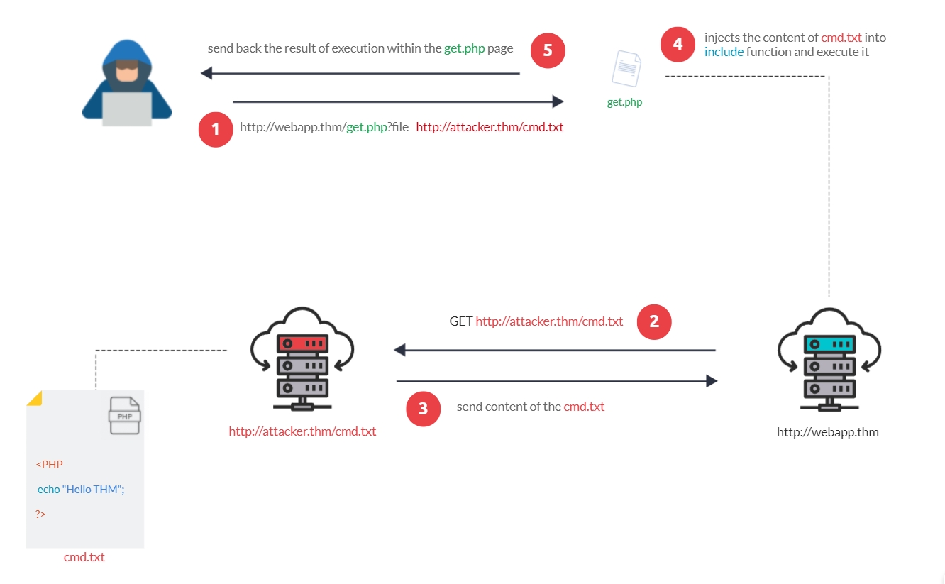 The following figure is an example of steps for a successful RFI attack! Let's say that the attacker hosts a PHP file on their own server http://attacker.thm/cmd.txt where cmd.txt contains a printing message  Hello THM.